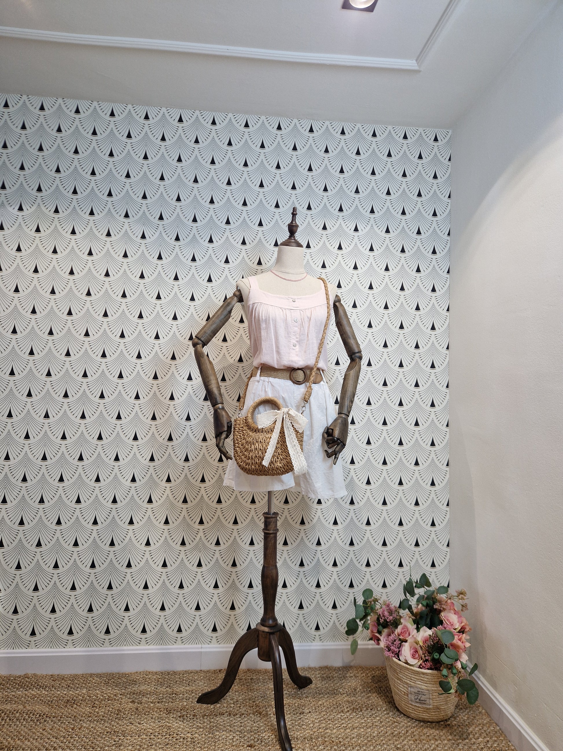 Elegancia natural para tus días de sol. Los shorts están confeccionados en una mezcla de lino fresco y suave, perfectos para mantenerte cómoda y estilosa en los meses más cálidos. Su corte relajado con vuelo ligero crea un movimiento fluido y favorecedor, mientras que el cinturón de rafia con hebilla aporta ese toque rústico-chic que eleva cualquier look.